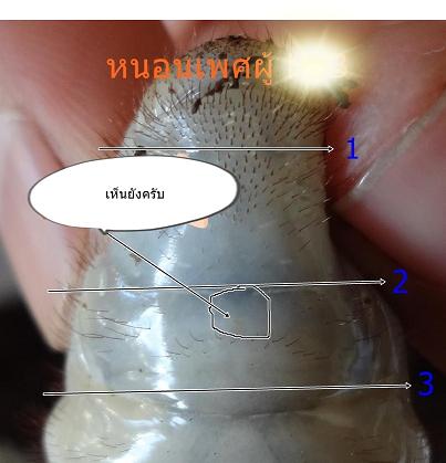 นับจากก้นปล้องที่3ตัวผู้จะมีเรียกว่าจุดก็ได้1จุดขนาด1มินครับตัวเมียไม่มีครับ