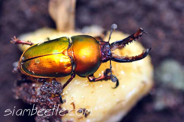 เพศผู้มีคีมยื่นยาวและโค้งขึ้น มีหลากสี แต่ปกติจะพบสีเขียวอมทอง ยังพบว่าในการเพาะเลี้ยงออกมามีการเพี้ยนของสีอื่นๆด้วย เช่น สีแดง ม่วง เขียว ฟ้า น้ำเงิน ดำ